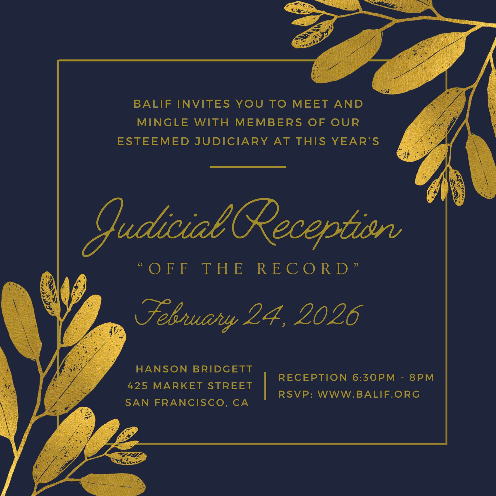 Please join members of BALIF and our esteemed judiciary for a judicial reception at Hanson Bridgett LLP, 425 Market Street, San Francisco on Tuesday, February 24, 2026 from 6:30-8:00pm. Enjoy an evening of meaningful connection, engaging conversation, and community as we gather with leaders from the bench and bar. We look forward to seeing you there!