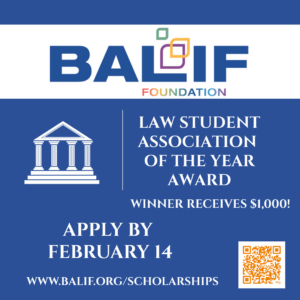 The selected law school association will win a cash prize of $1000 and will be recognized at the BALIF Annual Gala to be held on Friday, March 6, 2026 at the Julia Morgan Ballroom. (www.balif.org)